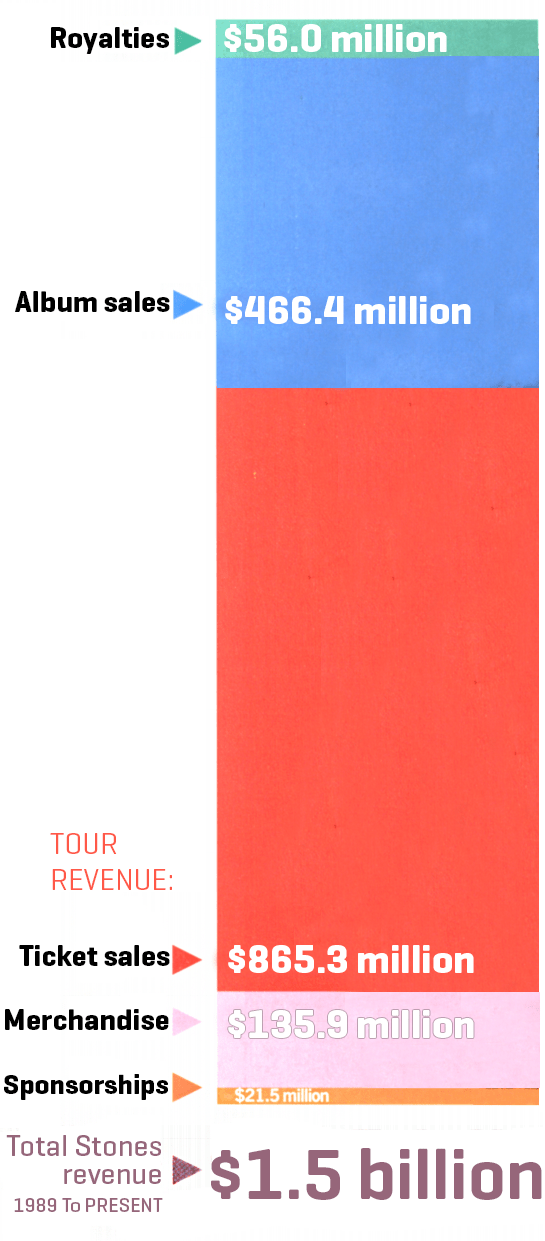 Interestingly, the Stones have never had a blockbuster album, like Fleetwood Mac’s Rumours or Michael Jackson’s Thriller. But what they have done is make 42 albums. And they’ve sold tens of millions of those records and CDs, and singles and EPs too. Since 1989 alone, for instance, the band has sold more than 38 million albums at roughly $12 each, for gross proceeds of over $460 million.