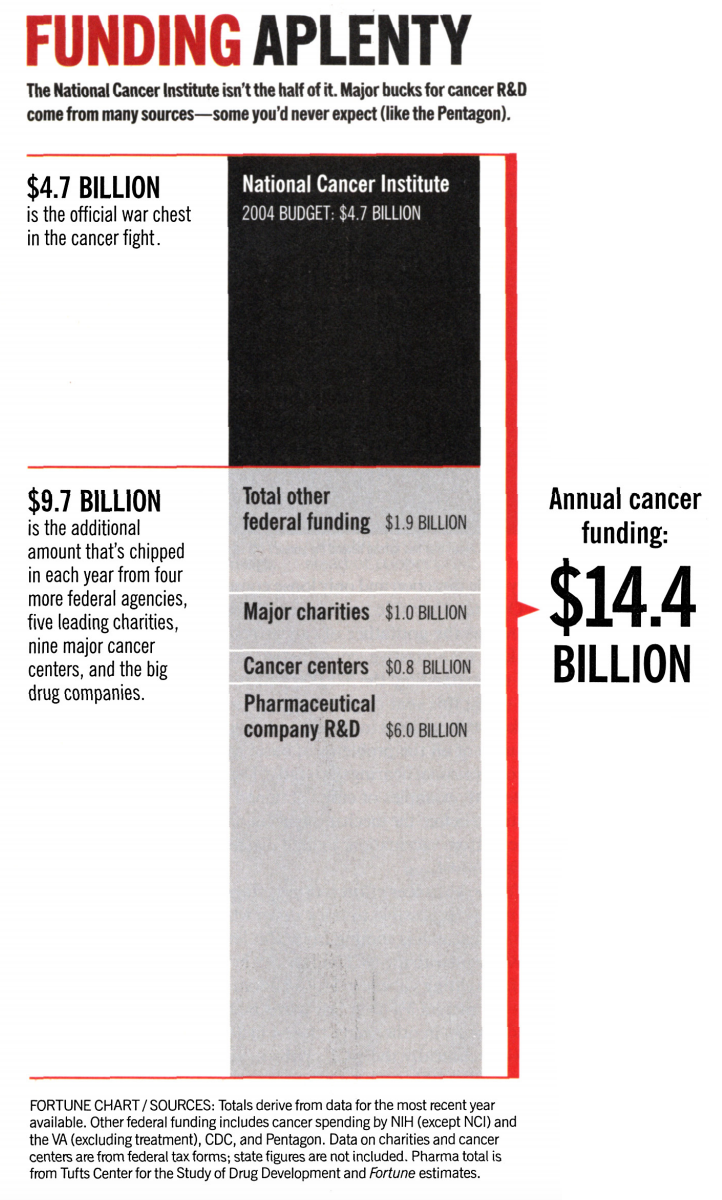 Today the cancer effort is utterly fragmented—so much so that it’s nearly impossible to track down where the money to pay for all this research is coming from. But let’s try anyway.