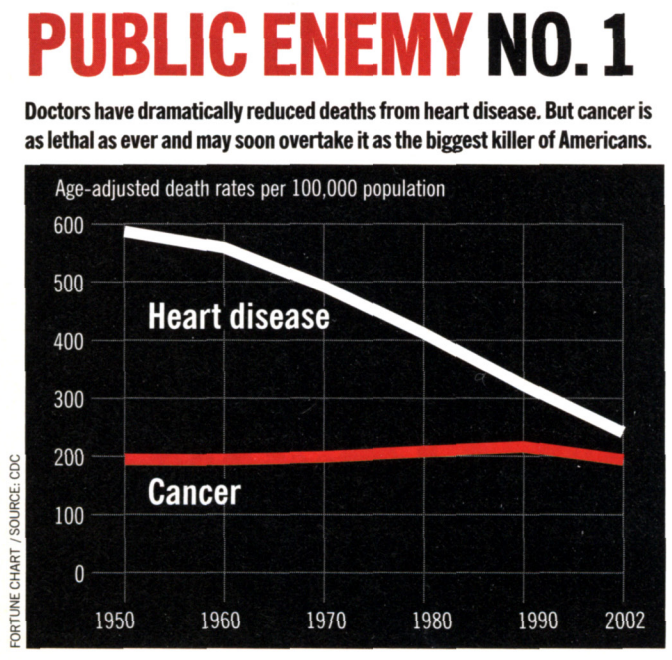 Researchers point out that people live a lot longer than they used to, and since cancer becomes more prevalent with age, it’s unfair to look just at the raw numbers when assessing progress. So when they calculate the mortality rate, they adjust it to compare cancer fatalities by age group over time. But even using this analysis (in which the proportion of elderly is dialed back to what it was during the Nixon administration), the percentage of Americans dying from cancer is about the same as in 1970 … and in 1950. The figures are all the more jarring when compared with those for heart disease and stroke—other ailments that strike mostly older Americans. Age-adjusted death rates for those diseases have been slashed by an extraordinary 59% and 69%, respectively, during the same half-century.