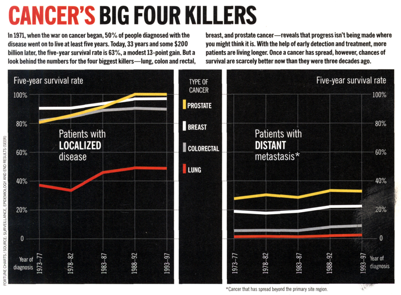 Yet very little of this modest gain is the result of exciting new compounds discovered by the NCI labs or the big cancer research centers—where nearly all the public’s money goes. Instead, simple behavioral changes such as quitting smoking have helped lower the incidence of deadly lung cancer. More important, with the help of breast self-exams and mammography, PSA tests for prostate cancer, and other testing, we’re catching more tumors earlier. Ruth Etzioni, a biostatistician at Seattle’s Fred Hutchinson Cancer Research Center, points out that when you break down the Big Four cancers (lung, colon and rectal, breast, and prostate) by stage—that is, how far the malignant cells have spread—long-term survival for advanced cancer has barely budged since the 1970s (see charts opposite).