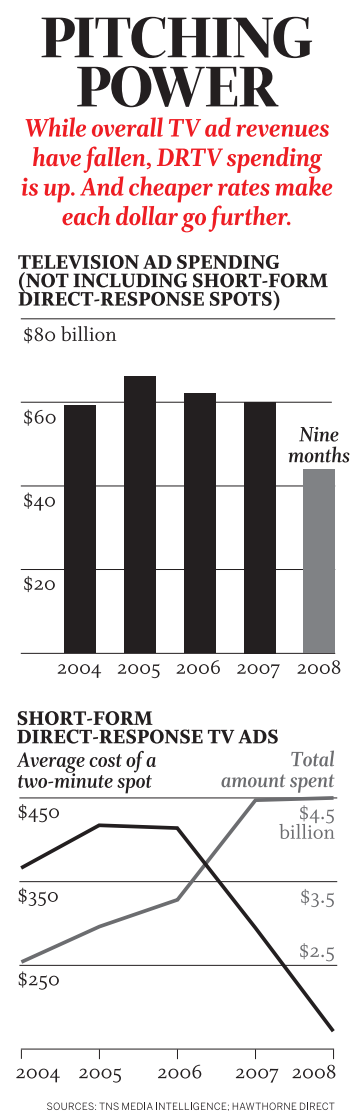 But it’s not just Mays and Sullivan you’ve been seeing more of lately. This is very much an infomercial moment. While banks are scrambling for bailouts, retailers are slashing prices, and industrial giants are cutting headcounts, the late-night-TV purveyors of “revolutionary” new fitness and skin-care products are thriving. Even as overall U.S. advertising spending fell 2.6% last year, according to Nielsen, spending on direct-response ads rose 9.2%. And sliding network and cable TV ad rates mean that the likes of Mays and Sullivan are getting much more airtime for their money. “Our industry has always done well during poor economic times,” says Dick Wechsler, president of DRTV (DTV) media buyer Lockard & Wechsler. “And right now things are pretty frothy for us.”
