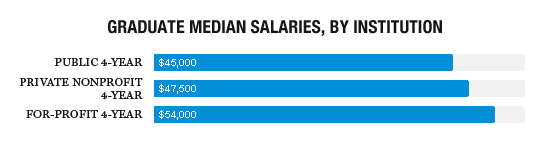 What is a shock is that the 65.2% of for-profit college grads who were employed and not in school earned a full-time median salary of $54,000. Graduates of private non-profit and public universities, on the other hand, made $47,500 and $45,000 respectively.