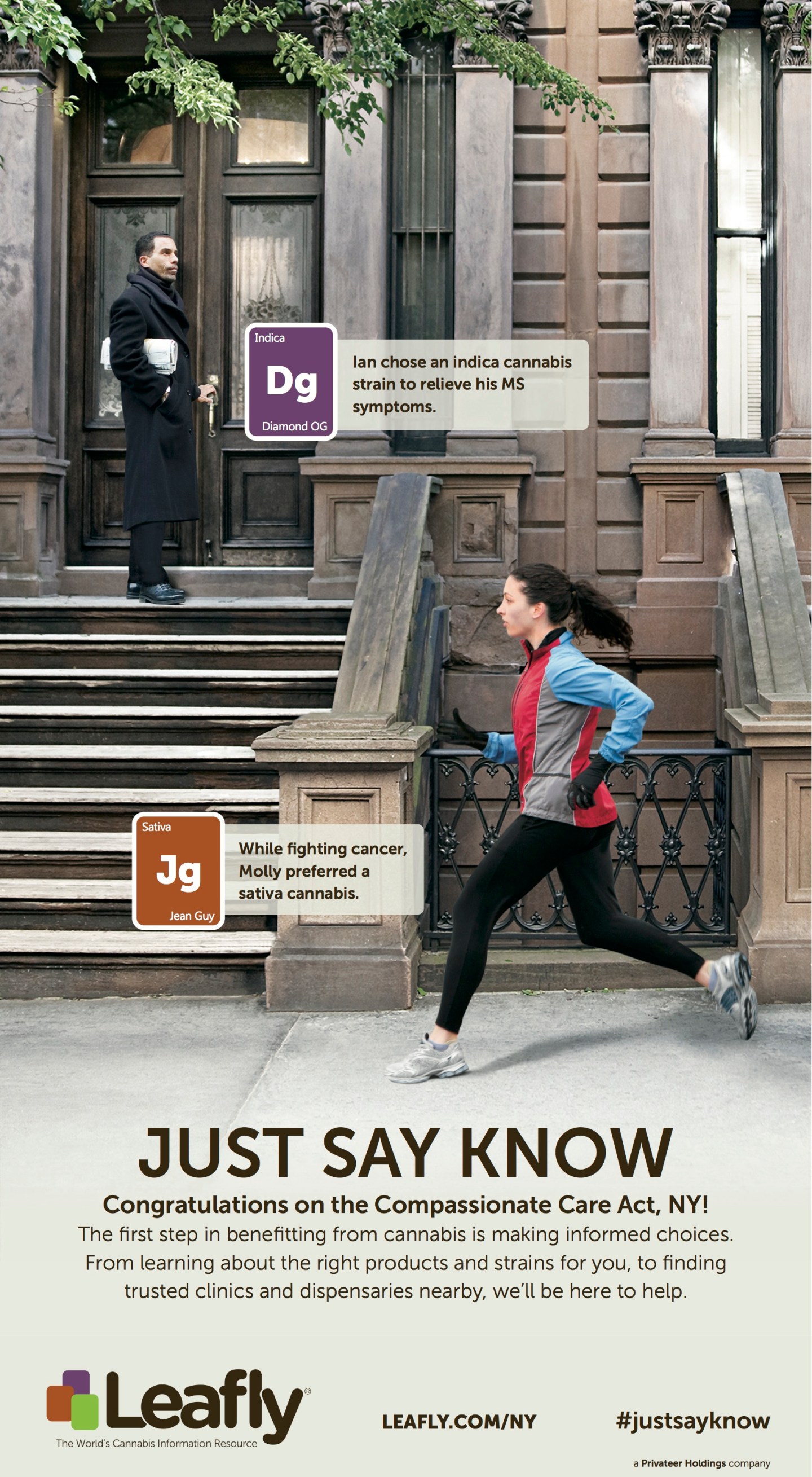 Leafly’s ad in The Times features the slogan “Just Say Know,” part of the company’s campaign to improve the public’s understanding of the increasingly legal (on the state level, at least) drug. The ad is in response to New York Governor Andrew Cuomo signing into law a bill last month that legalized medical marijuana in his state.
