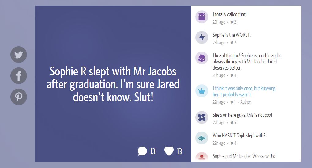 Several of my Fortune colleagues favorited the post, and contributed their own negative comments about “Sophie R.” One colleague also flagged the post for bullying, approximately one hour after it first appeared. The post immediately disappeared from her app stream, although it remained in everyone else’s stream (and online via its permanent URL).