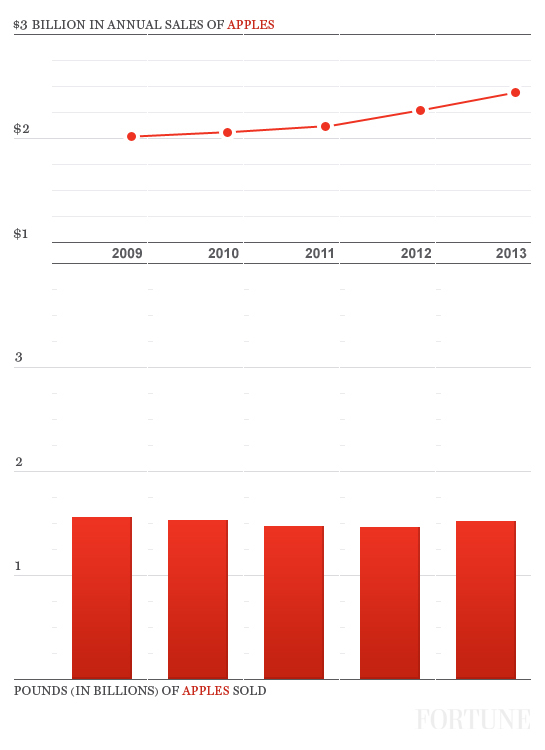 Staple fruits like apples are often the ones that lose out when consumers sample new types of fruit, Frey says. But a new iteration of this American standby has lifted the category’s overall sales since 2009: pre-cut apples. Sales of sliced apples, which are often packaged with dip or in parfaits, are priced higher than fresh whole apples and neared $177 million in sales in 2013, an increase of 72% over the past five years.