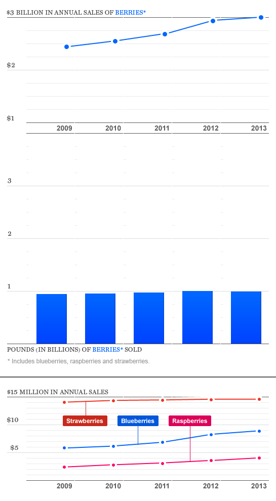 Nielsen groups all berries as one category, and with just over $3 billion in sales last year, it is the highest-grossing fruit. It captured that title thanks in part to the category’s “super food” designee: blueberries.