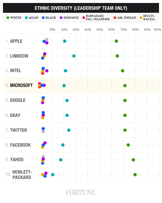 When it comes to overall racial and ethnic diversity, Microsoft falls toward the back of the pack, with 61% of employees identifying as Caucasian. Yahoo (YHOO) has a 50% Caucasian headcount, though Apple (AAPL) has agreaterpercentage of minority workers, especially among Hispanic (11%) and black (7%) employees.