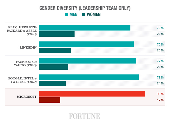 Overall, the Microsoft staff is heavily male, with just 29% of the staff female. But that is not the most male-dominated company. That award goes to Intel, which is 23% male. However, Microsoft's stat is still impressive (in a negative way), considering that the company has 128,000 employees worldwide.