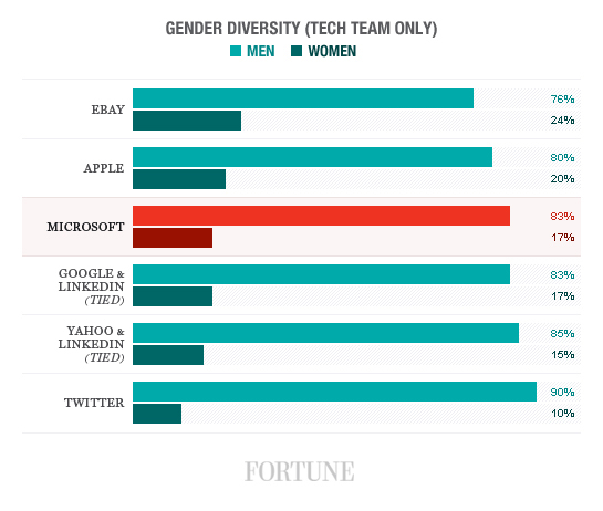 The gender imbalance is even more pronounced when you examine the technical ranks; only 17% of programmers, coders and other engineering-type roles are held by women at Microsoft. Microsoft's standing -- though average for the industry -- is still better than Twitter's (TWTR) 10% female tech headcount.