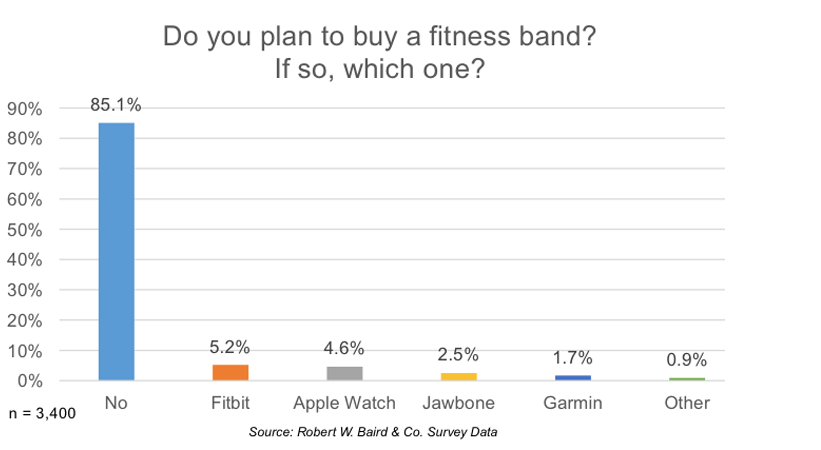 On Monday, Baird’s William Power issued a report to clients that included the attached chart. In a survey of 3,400 U.S. consumers, 85% said that they weren’t in the market for a fitness band.