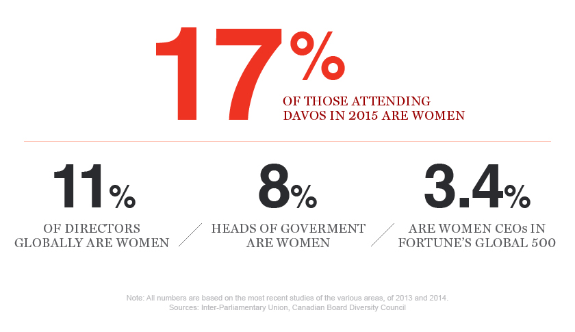 Consider this: In 2011, the World Economic Forum did make a concerted effort to recruit more women to its annual meeting. It created a gender quota system, requiring large corporations to bring one woman for every four men who attend Davos. The quota won’t do much, though, if women aren’t crowding companies’ corner offices. As Barri Rafferty, CEO of Ketchum North America, pointed out in an interview with Fortune’s Caroline Fairchild, “If your company is going to send five people, they are going to look at their C-Suite people, which likely has fewer women.”