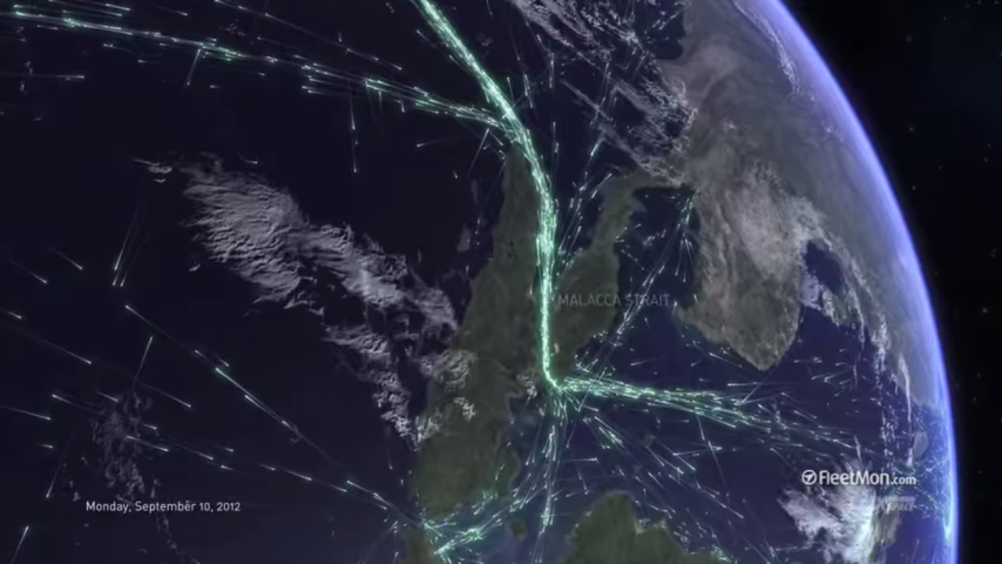 The video shows satellite tracking of routes superimposed over Google Earth. It focuses on some of the main choke points for international shipping, such as the Strait of Malacca on the southern tip of Malaysia, the Suez Canal, the Strait of Gibraltar and the Panama Canal. It’s a good reminder that about 90 percent of all the goods traded globally spend at least some of their transit time on a ship.
