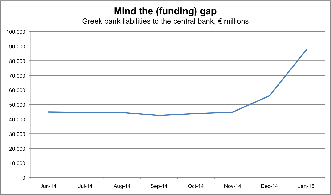 The thing to bear in mind here is that the ECB has capped at €68.3 billion the amount that it’s willing to lend against debt issued or guaranteed by the Greek government. As the chart shows, they were already borrowing over €87 billion by the end of January. It seems a fair guess that most of the Greek banking system’s remaining assets, down to the contents of the janitors’ cupboards, have already been pledged as collateral too.