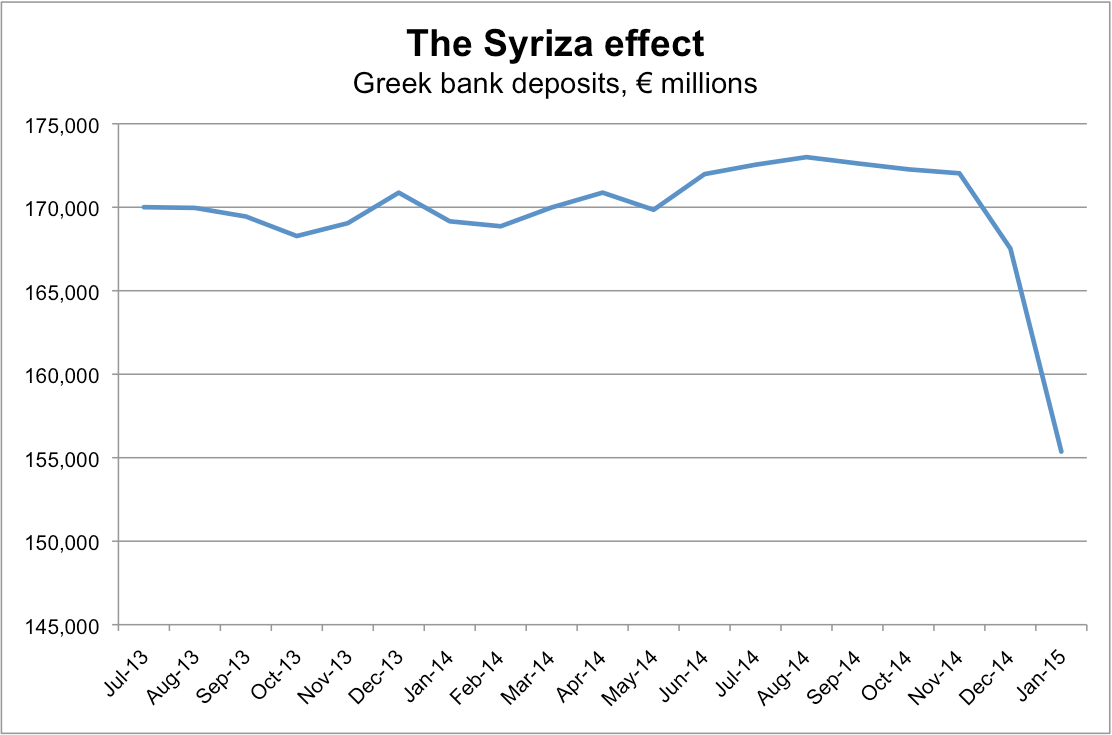 This chart kind of makes things clear: in January alone, Greeks pulled over €12 billion, or 7.6% of all their deposits, out of local banks. Bear in mind that Syriza only took office on the 26th, that its brinkmanship carried on for a full two weeks after the cut-off date for this chart, and that outflows probably picked up as the news flow intensified.