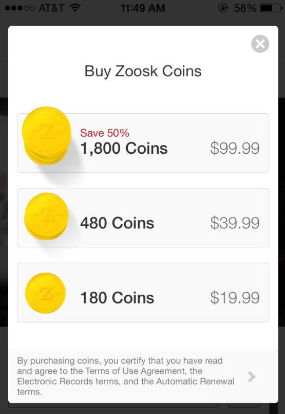 At its current pricing, 180 Zoosk Coins will run you $20—that’s about 11 cents per Zoosk Coin. Or, at bitcoin’s value at the time of writing, .0004407 bitcoin.
