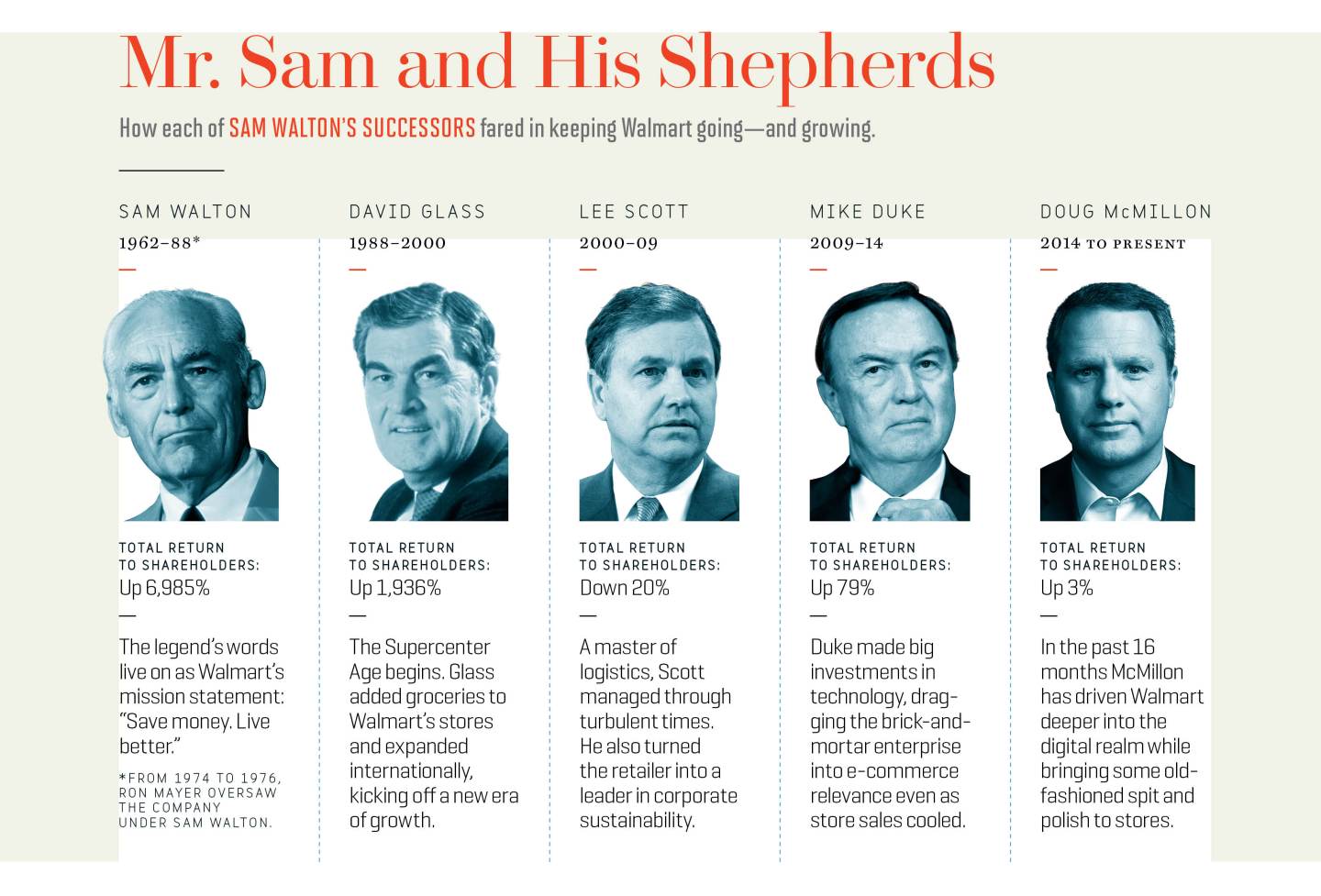 “I told the board that I thought that he would be the best CEO since Sam,” says Lee Scott, who succeeded Glass in 2000 and served nine years as Walmart’s chief executive. “I think he’s prepared so much better than we were. And his view of the world, his understanding of the context of Walmart within that world, his age and youth in an environment that’s changing so quickly—all of that I think is going to give him more energy to embrace change rather than try to simply cope with change.”