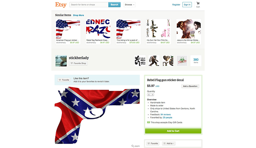 Etsy says it is in the process of taking the Confederate flag items down, but as of 3 p.m. EST, some of the most offensive items, including a Confederate flag gun decal, were still available for sale on its website. Here are some of the other items that were for sale.