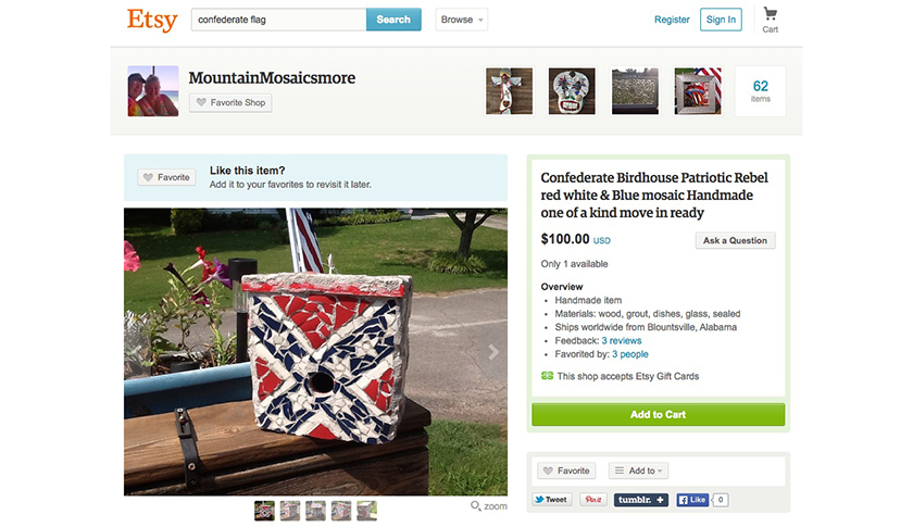 Apparently, Etsy now thinks Confederate flags are “inconsistent” with its values. Up until Tuesday afternoon, the online marketplace known for its artisan and handcrafted wares had 24 pages of items with images of the Southern separatist banner for sale on its website.