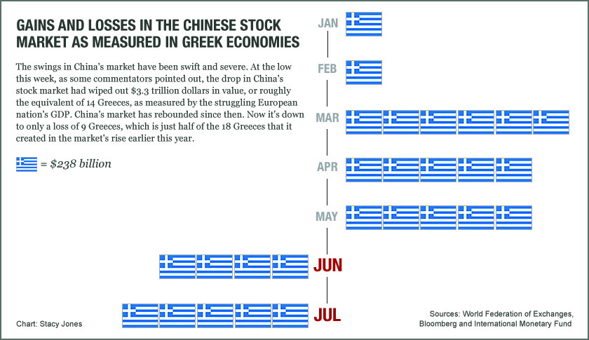 Earlier this week, in a mashup of economic woes, a number of commentators pointed out that the $3.3 trillion that had been lost in China’s market swoon made up the equivalent of 14 Greeces, as measured by that country’s GDP. Nice stat! China’s market has since recovered a bit. So we are now down to $2.1 trillion in lost wealth, or roughly nine Greeces, since mid-June. So that’s good news. But also still a lot of Greeces.
