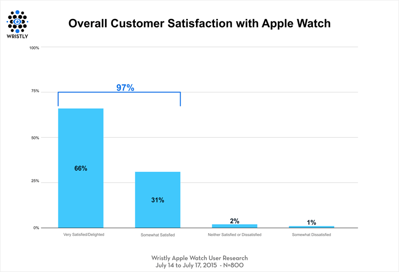 Among the 800-plus Apple Watch owners who responded to last week’s Wristly survey, 97% described themselves as either very satisfied or somewhat satisfied with the device.