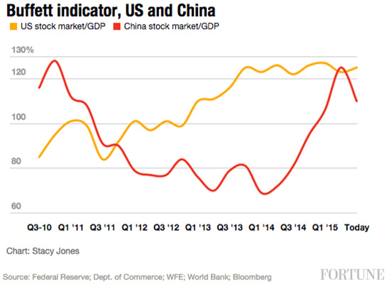 So, what does Buffett’s favorite market indicator say about Chinese stocks right now? It offers a surprisingly positive message, especially compared to what it is saying right now about the U.S. After China’s recent market drop, the total value of all Chinese stocks (I added up the value of shares on China’s two main exchanges, the Shanghai and the Shenzhen, as well as the Hong Kong’s Hang Seng market, where many mainland Chinese companies have long traded) to China’s GDP (plus Hong Kong’s) is 110%.