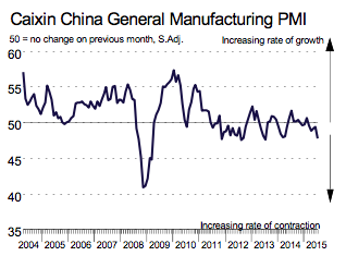 New manufacturing data shows that the Chinese economy is failing to recover after multiple interest rate cuts and fiscal spending programs. The Caixin China Manufacturing Purchasing Manager’s Index (formerly HSBC’s PMI) fell to 47.8, which indicates economic contraction. It’s worse than the flash reading that was released last week. Industrial output fell to the weakest level since November 2011. “The official PMI was also weaker than expected for the month of July, suggesting that the manufacturing sector may again be losing momentum,” wrote HSBC economists Julia Wang and Qu Hongbin today in Hong Kong.