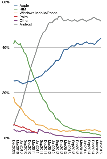 Smartphone OEM Market Share: 190.3 million people in the U.S. owned smartphones (76.7 percent mobile market penetration) during the three months ending in June. Apple ranked as the top OEM with 44.1 percent of U.S. smartphone subscribers (up 1.5 percentage points from March). Samsung ranked second with 28.1 percent market share, followed by LG with 8.3 percent, Motorola with 4.9 percent and HTC with 3.4 percent.