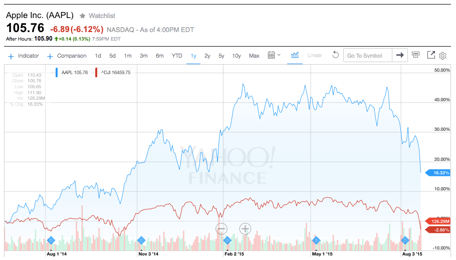 This week, as you’ve probably heard, Mr. Market freaked out about China, a country whose growth many Dow components, including Apple, were counting on to buoy their growth.