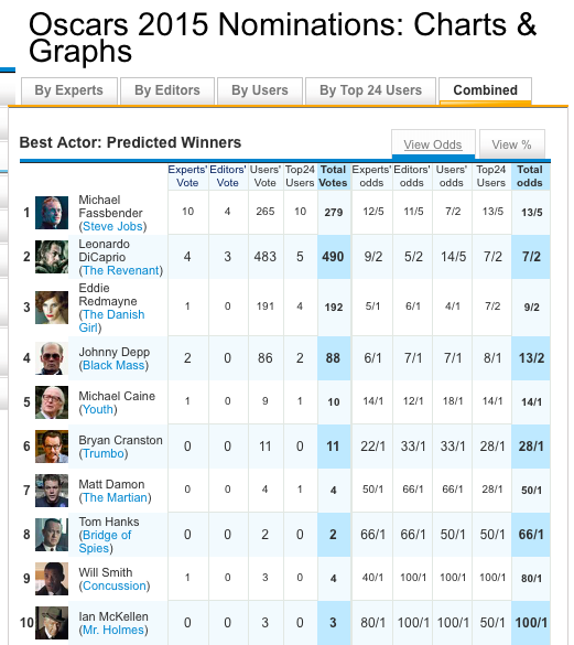 The Monday morning odds on GoldDerby, a crowd-sourced prediction site, put Fassbender’s chances at 13/5, ahead of DiCaprio (7/2), Depp (13/2) and Damon (50/1).