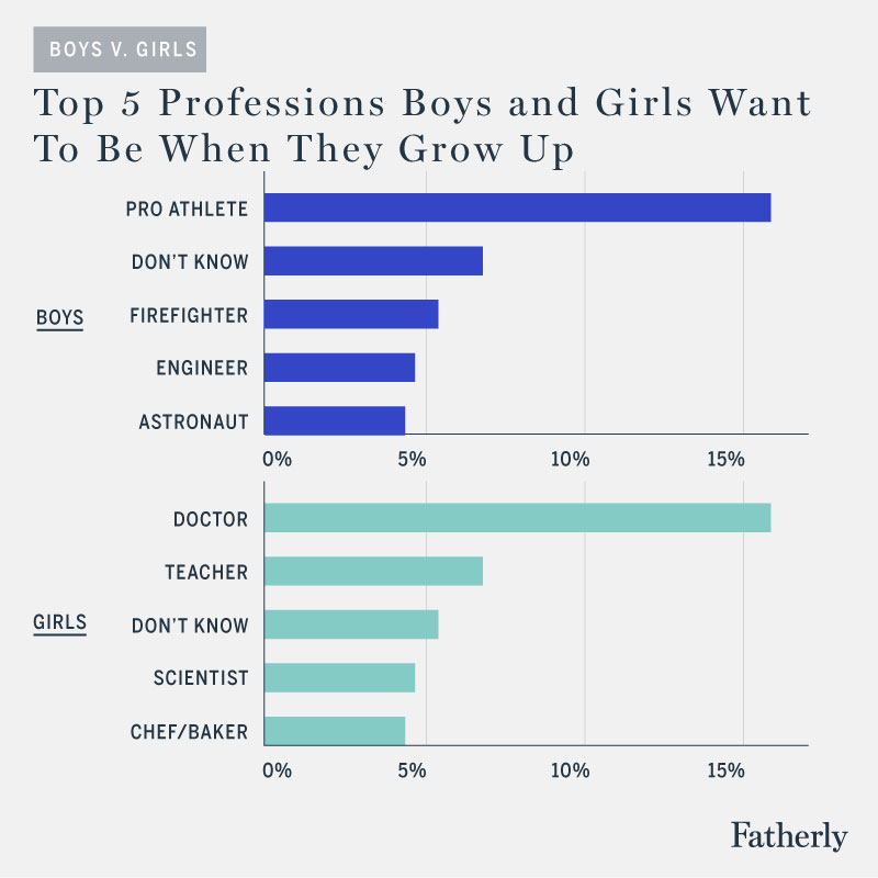 Back in 1989, a study published in the British Journal of Guidance and Counseling found that 11-year-old boys were most interested in becoming an athlete, a service member, or an engineer. Now, a new survey of children 10 and younger, released last week by Fatherly, a site for millennial dads, found that boys’ career dreams have stayed relatively stable. Pro athlete once again came in at No. 1, followed by firefighter and engineer.