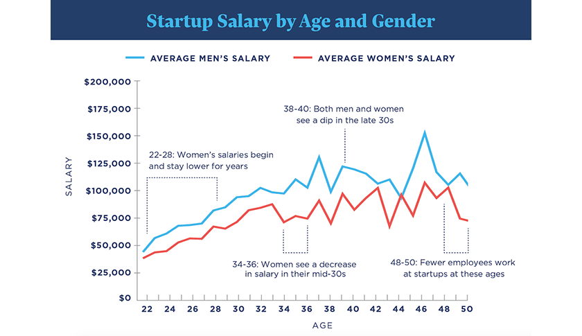 Justworks, an HR platform for small businesses, also broke out the salary gap by age, finding that women consistently make less than men. The one exception—women in their mid-forties—can likely be attributed to a small sample size for that age group, says Oates, who notes that his company’s clients tend to have fewer employees in their 40s and 50s. The analysis also reveals that startups remain overwhelmingly male: Just 36% of the employees of the 2,300-some companies included in the report are women.