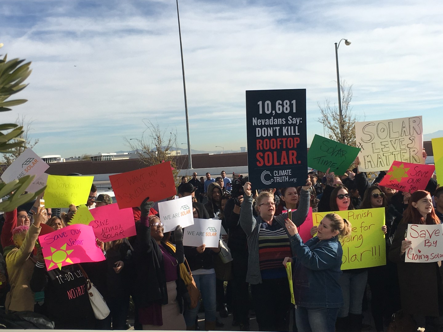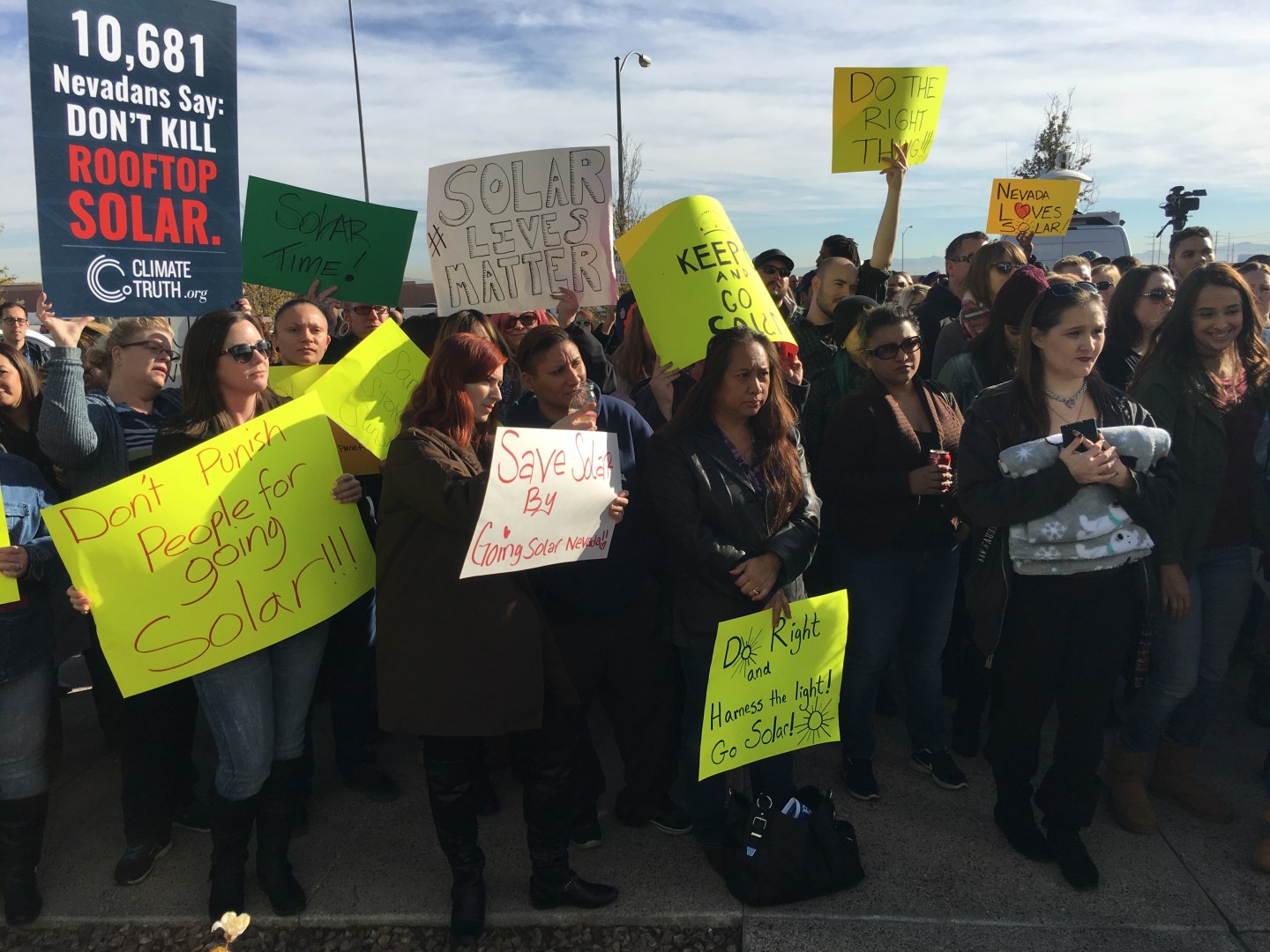 The angry protestors are gathered outside of the office of Nevada’s Public Utilities Commission, the regulatory body that sets rules for the state’s electricity, gas, and water utilities. Among the crowd are homeowners who bought solar panels, and workers who have been earning a living by installing rooftop solar panels.