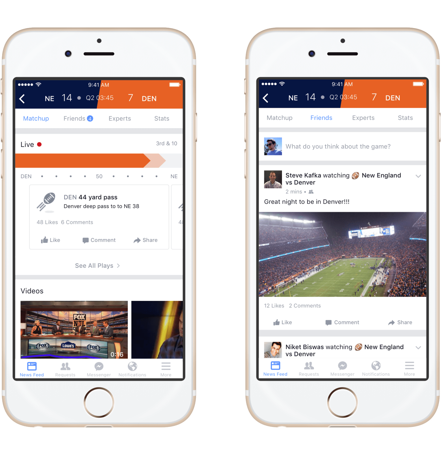 The product features multiple tabs: One will offer play-by-play game updates and scoring along with video content, while another is devoted to game-specific posts from users’ friends that appear chronologically. A third tab features commentary from “experts”—verified users such as journalists, athletes, and even team accounts—while the final tab reveals detailed game statistics.