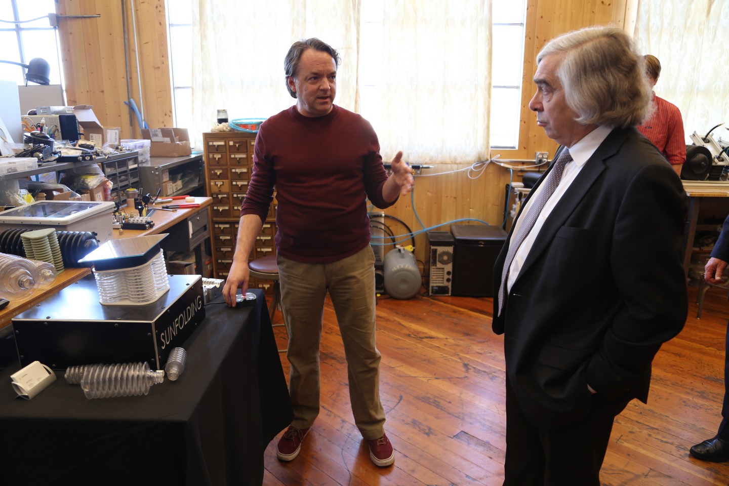 At the start of the tour, Moniz told the lab’s founder, Saul Griffith, that he was there to see “neat stuff.” What he saw was a new type of solar tracker, temperature-changing fabric, a desktop milling machine, and a natural gas tank shaped like an intestine.”