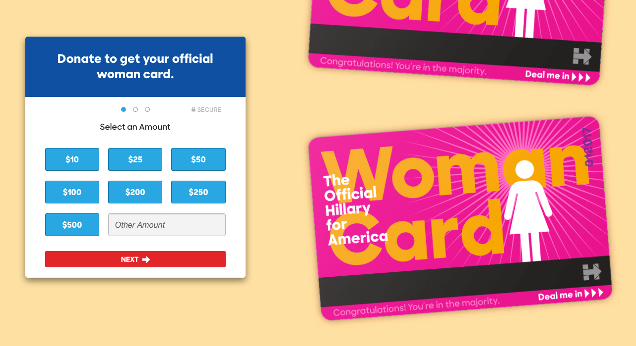 Now, her campaign, which knows a good meme when it sees one, is taking that sentiment one step further, offering supporters who donate an “official woman card.”