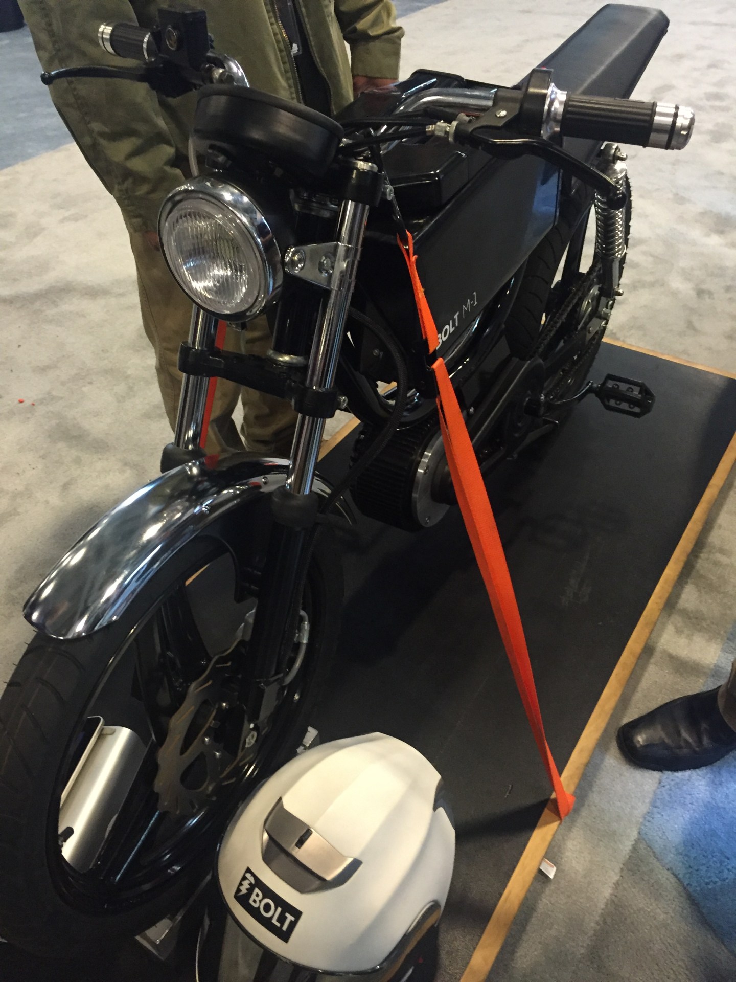A startup called Bolt Motorbikes showed off its battery-powered hybrid motorcycle and bicycle. It uses technology by Intel subsidiary Wind River that connects its hybrid bikes to the Internet so that riders know whether the tires are getting to low or if their bikes need to go to the repair shop, explained Bolt Motorbikes CEO Josh Rasmussen.