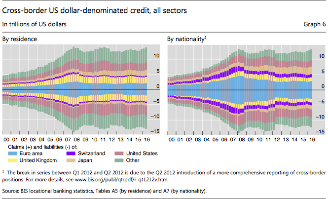Maybe not very. If the dollar is strengthening on anticipation of a policy that will close the U.S. market to Asian exporters, then it’s quite reasonable to assume that a European bank (which has to hold more capital anyway against what is, for it, a foreign currency exposure) will be less likely to lend dollars to such exporters. And that nexus matters: European banks have lent more dollars ($671 billion) to Asia than U.S. ones have ($571 billion), according to the BIS’s data. Now think for a second about how over-extended China’s banking sector is, and how hobbled by financial repression Europe’s is, and you’ll see why the wonks in Basel are so worried.