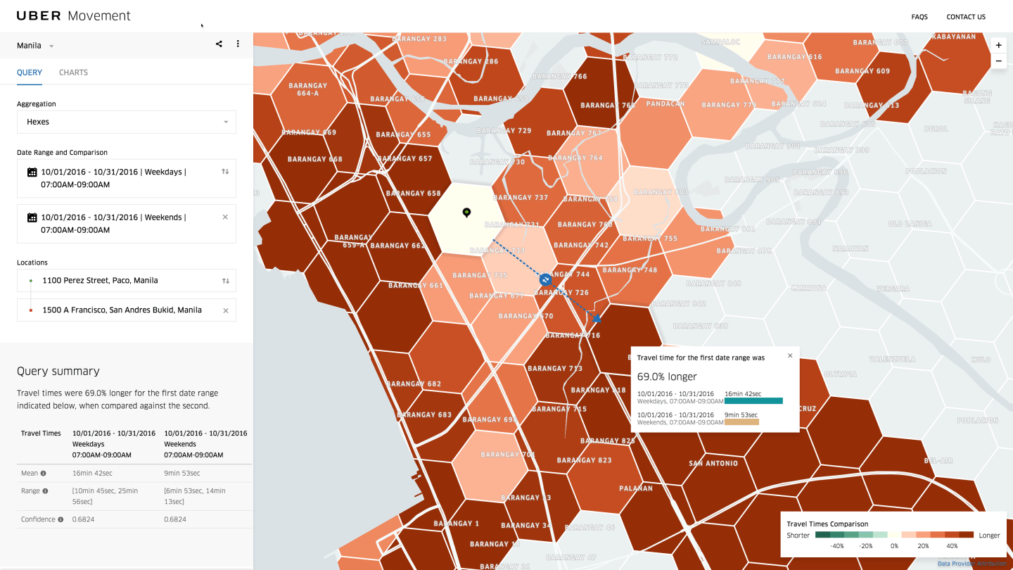 While Uber already shares some data with select cities, Movement will be the company’s first publicly available tool. The website is currently live, with data from three cities that have participated in Uber’s beta program for Movement: Washington D.C., Sydney, and Manila. Eventually, the company hopes to launch the website in all of the markets where it provides ride-hailing services, and expects to have data for dozens of markets in the coming months.