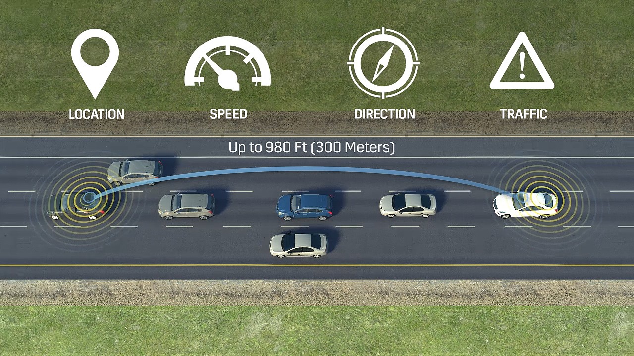 The V2V feature uses dedicated short range radio communication (DSRC) and GPS to transmit 1,000 messages per second from other vehicles up to nearly 1,000 feet away. V2V communications is considered by many in the automotive and urban planning fields a necessary piece of technology for safer, less congested roadways and the eventual deployment of autonomous vehicles.