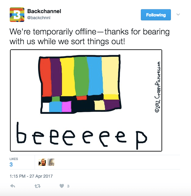 “We’re temporarily offline—thanks for bearing with us while we sort things out!” Backchannel posted on Twitter in the interim. (This site and the others are now back online.)