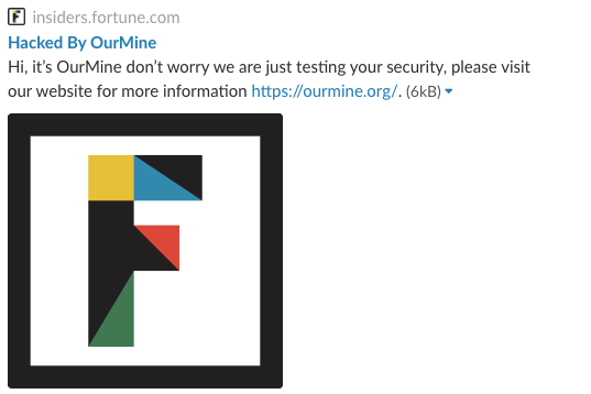 The vandals did the same to a Fortune’s “insiders” blog, which is independent from the website you’re currently reading. “Hacked By OurMine,” the group wrote on the Medium page, changing the content of existing posts. “Hi, it’s OurMine don’t worry we are just testing your security,” the group said, before directing people to the its own website. (We do not recommend visiting their site.)