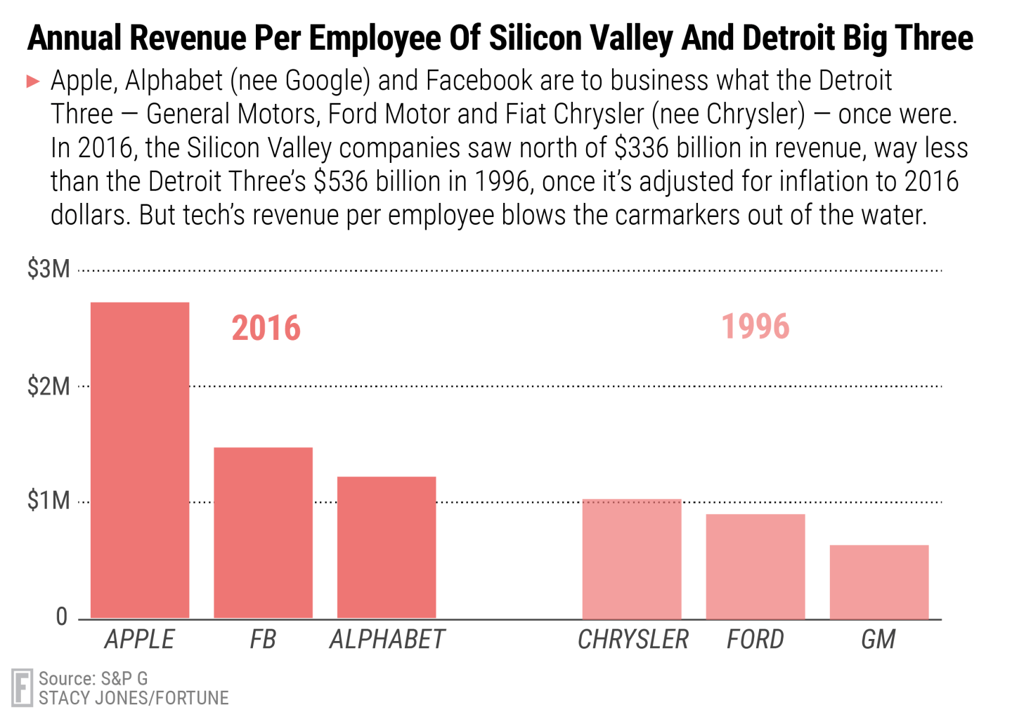 As bad as things are for the car industry, GM still employed 225,000 U.S. workers in 2016. That’s nearly twice as many people as Apple, and around 13 times more people than Facebook. Still, Facebook managed to rake in over $7 billion in revenue during the third quarter of 2016.