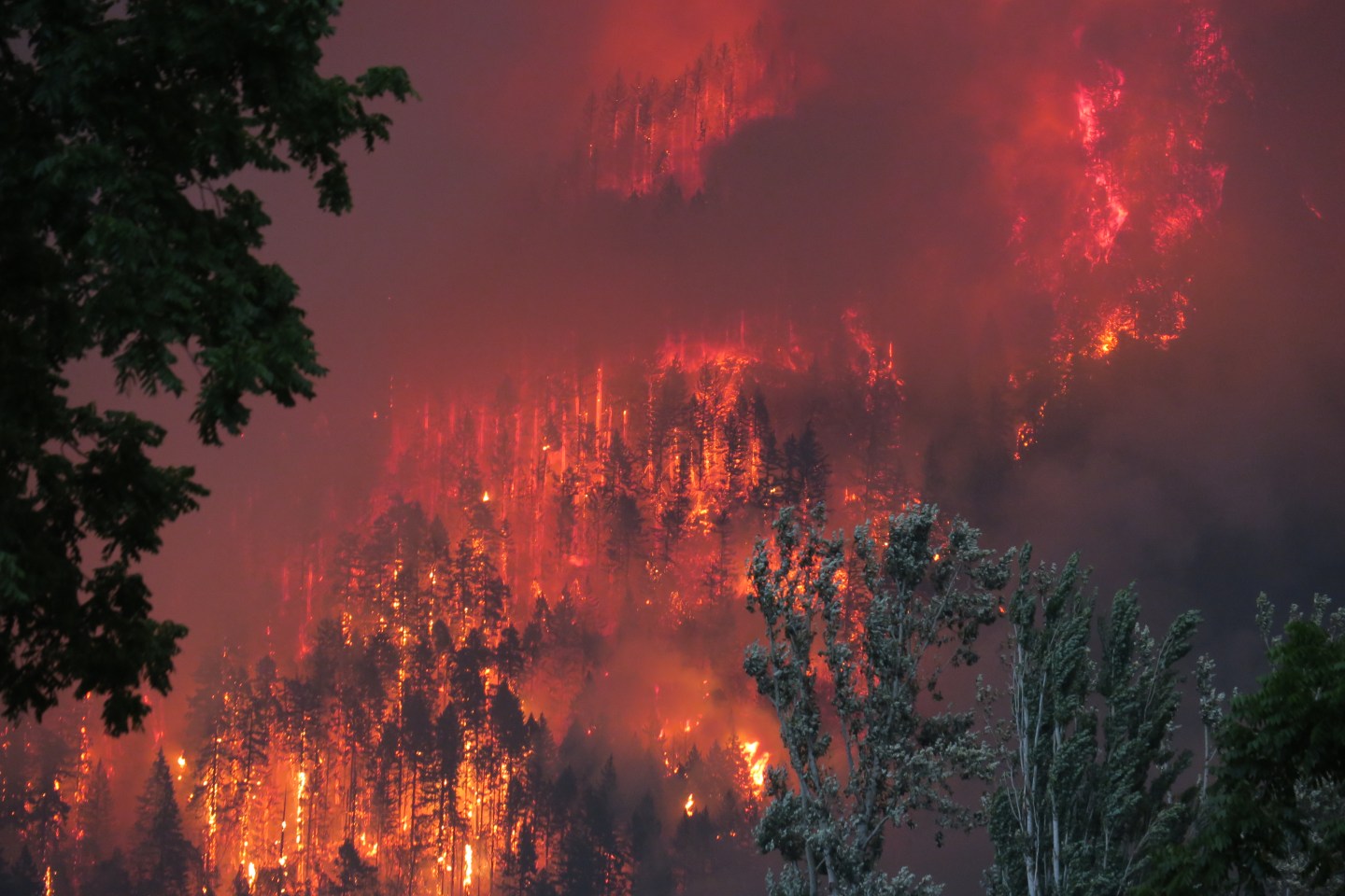 On Sunday the sky was awash with ash, so McCluer was grounded. On Monday, visibility was even worse, so instead of staying home, she grabbed her camera and drove off towards the gorge on the Washington State side, since Oregon’s I-84 was blocked by downed, burning trees. McCluer’s plan was to drive to the Bridge of the Gods, the span closest to the fire that connects Washington and Oregon, and capture images of the burning forest.