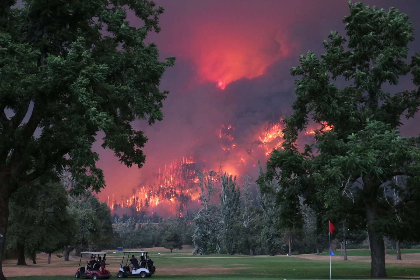 For days, a photo of three golfers putting near what appears to be the setting of Dante’s Inferno in Oregon has been making its rounds on the Internet, with commenters doubting its too-crazy-to-be-real imagery and claiming the picture had been altered. Not so, says amateur photographer and Columbia River Gorge aficionado, Kristi McCluer. And she would know—she snapped the photo of the blazing Oregon fire.