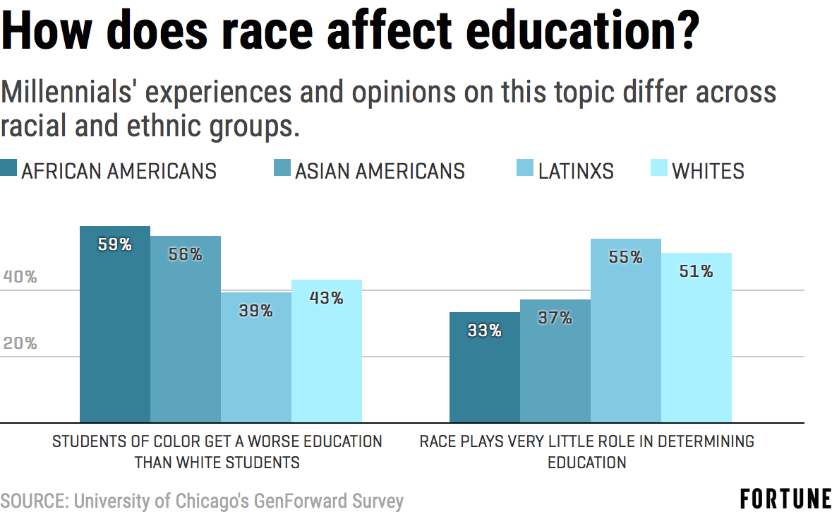 More than half of African American and Asian American respondents said students of color receive a worse education than white students, while the majority of Latinx and white millennials said race plays a very small role in determining the quality of education.
