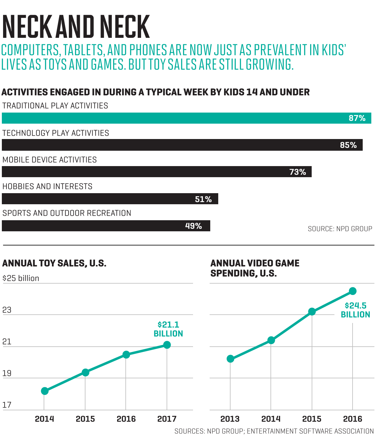 But here’s the problem: Kids may love screens, but it’s not clear that they like “tech toys.” The toys they gravitate toward—or at least the toys their parents buy for them—remain largely analog. Think Pokémon cards, Nerf guns and balls, and, yes, Barbie dolls, all among the five bestselling toy properties this year, according to research firm NPD Group. “There are pockets driven by technology,” says Juli Lennett, an NPD analyst. “But most growth still tends to be driven by some of the classic play patterns.” Another example: The fastest-growing category of toys sold so far this year was games and puzzles, a grouping that doesn’t include video games. As Stephen Pasierb, CEO of the Toy Association, a trade organization, argues, “Many parents want their kids to have some digital detox.”