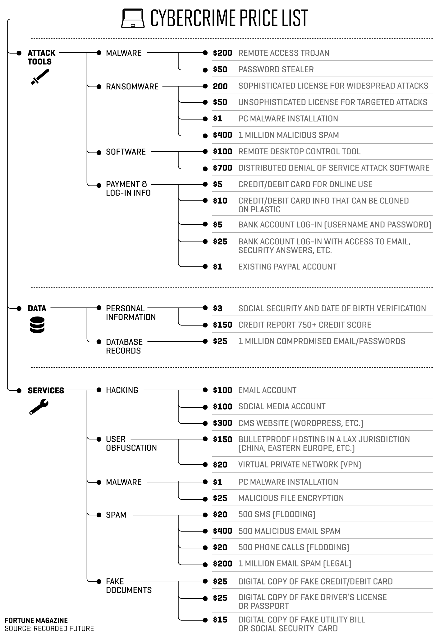 Cybercrime is growing ever more pervasive—and costly. According to researcher Cybersecurity Ventures, the annual cost of cybercrime globally will rise from $3 trillion in 2015 to $6 trillion in 2021. Enabling this boom are thriving marketplaces online, where hackers sell tools and services to criminals. Virtually anything is available for the right price, points out Andrei Barysevich, director of advanced collection (“a fancy name for ‘spy,’ ” he says) at threat intelligence firm Recorded Future. A former consultant for the FBI’s cybercrime team in New York, Barysevich trawled the shadiest corners of the web to compile the cybercrime shopping list above, exclusively for Fortune. In the market for some basic malware? It’ll cost you as little as $1.
