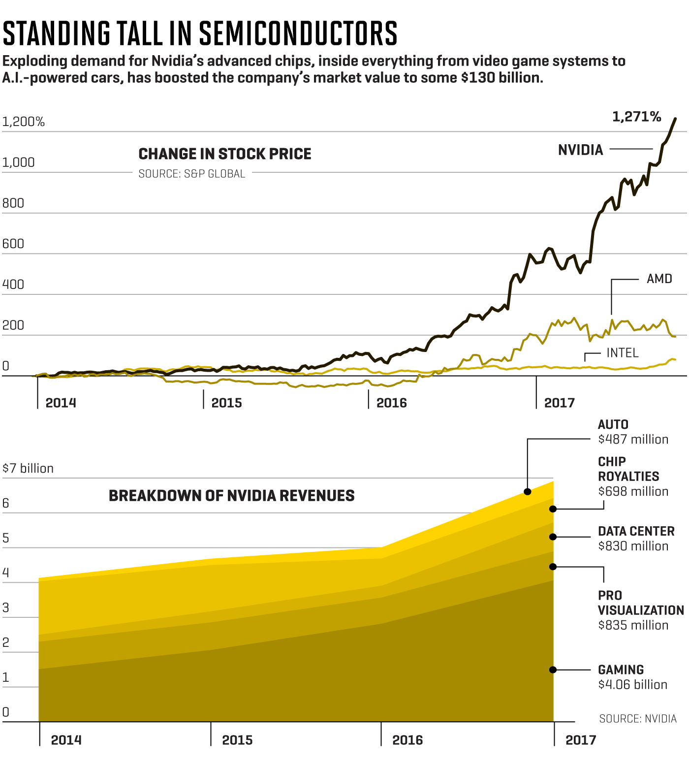If you haven’t heard of Nvidia, you can be forgiven. It doesn’t make a chat app or a search service or another kind of technology meant to appeal to the average smartphone-toting consumer. No, Nvidia makes the muscular mystery stuff that powers all of it. Its GPUs, or “graphics processing units,” crunch the complex calculations necessary for cryptocurrency markets, so-called deep neural networks, and the visual fireworks you see on the big screen. The same technology that makes brutally realistic shooter games come alive helps self-driving cars take an “S” curve without assistance—enabling computers to see, hear, understand, and learn.