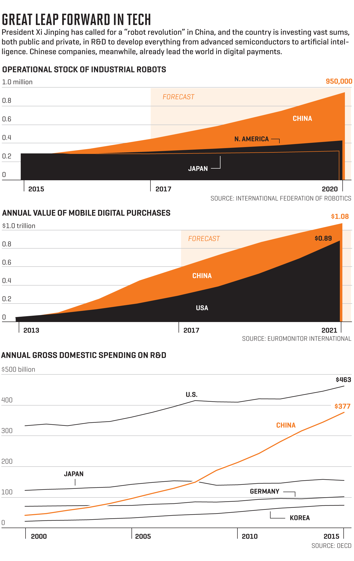 Will China dominate the technologies of the future? Beijing has moved forcefully to promote development of artificial intelligence and encourage the use of industrial robots. For now China remains a laggard in “robot density.” In 2016, it had only 68 robots per 10,000 manufacturing workers, according to the International Federation of Robotics, compared with 631 in South Korea, 309 in Germany, 303 in Japan, and 189 in the U.S. China has been the world’s largest buyer of robots since 2013. Last year it bought about 87,000 robots—or about one in three of 294,000 robots sold in the entire global economy. China’s planners have set a goal of raising the ratio of industrial robots to 100 per 10,000 workers by 2020. Xi Jinping, meanwhile, has called for a “robot revolution” in China.