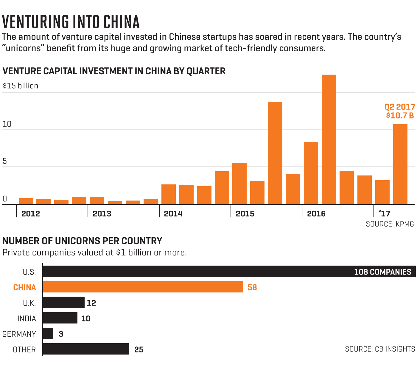 Consider that between 2014 and 2016, China attracted $77 billion in venture capital investment, compared with just $12 billion in the preceding two years. China is now among the world’s top three markets globally for venture capital in digital technologies including virtual reality, autonomous vehicles, 3D printing, drones, and artificial intelligence. And about a third of the world’s 262 “unicorns” (startups valued at more than a billion dollars) hail from China, according to McKinsey & Co., and account for 43% of the global value of such companies.